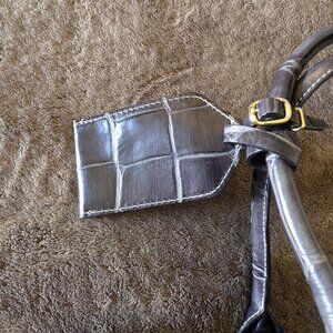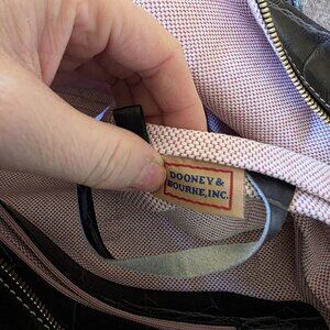 Luxury leather travel duffel by Dooney & Bourke featuring the hard-to-find croc-embossed finish. This bag has a beautiful structured silhouette with rich texture, gold-tone YKK zipper hardware, rolled leather handles, luggage tag, and interior organizational pockets — perfect for weekend trips or carry-on travel.