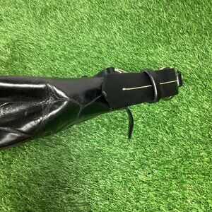 Black croc embossed leather, top zipper closure, single thick strap for shoulder or arm. Good used vintage condition. It does have some wear on the corners, please see photos.