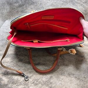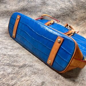 Here is an absolutely stunning satchel/mid size handbag from Dooney & Bourke. This is a classic/iconic bag from D&B, with a highly detailed croc embossed leather outer in brilliant blue, called Marine Blue. The natural/lighter oiled leather compliments the blue incredibly well, finished off with brass hardware. Inside is a bright, cherry red. This is a durable bag, made incredibly well and will last. Multiple interior pockets with key strap with snap, external zipper, and small outer zipper pocket. Has double handles and adjustable/detachable shoulder strap.
