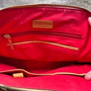 This handbag, overall has been lightly used with the light/natural leather showing very little aging or discoloration. However, there are a few minor blemishes on the outside, in what appearing to be minor paint or color transfer from another item. These likely could be removed, however we are not experienced in working with higher end purses to try ourselves. The inside shows minor/faint staining and signs of use.