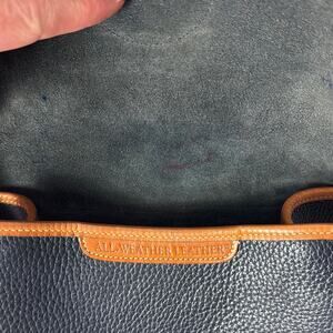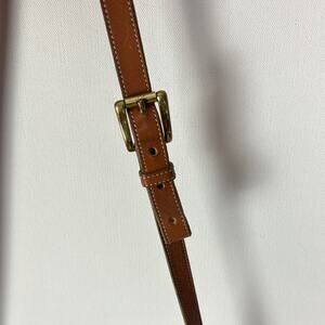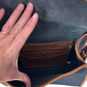 Gently Used Dooney & Bourke Crossbody Bag. Dark brown and with lighter brown accents. High quality genuine leather. Maybe a bit of a vintage / retro item (Made in USA). Metal studs on the bottom. Interior is a smooth suede like feel. Interior wallet. Great purse!