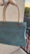 Elegant tote with signature monogram. Light blue with tan accents. Perfect for daily use.