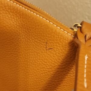 Luxurious leather tote with spacious interior. Features sturdy handles and front zipper pocket. Perfect for daily use. small flaws please see pictures.