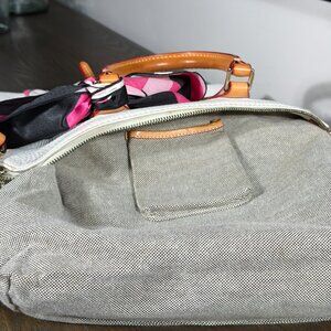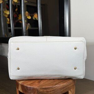 👜✨ Dooney & Bourke Dillen satchel • pre-loved • white pebbled leather with tan trim & red piping • double exterior zip pockets • top zip closure • adjustable/detachable shoulder strap included