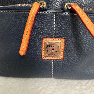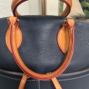 Truly a classic, multi season and multi use handbag! Dark blue/navy pebbled leather with tan accents.