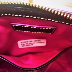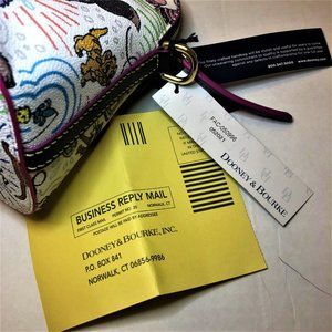 Dooney & Bourke Allover sketch pattern features Disney famous cats: Duchess, Berlioz, Toulouse (The Aristocats); Lucifer (Cinderella); Dinah (Alice in Wonderland); Oliver (Oliver & Co.) ; Yzma as Cat (The Emperor's New Groove); Figaro (Pinocchio); Cheshire Cat (Alice in Wonderland); Madam Min (Sword in the Stone); Rufus (The Rescuers); and Binx (Hocus Pocus) * Stitched leather trim with pink edging * Exterior zip pocket with leather pull * Two interior slip pockets * Top zip closure with leather pull * Interior key hook * Detachable adjustable shoulder strap * Fully lined * Metal feet * Goldtone hardware * ''Dooney & Bourke 1975'' embossed leather label inside * ''Dooney & Bourke'' embossed logo plate on front * Part of the Disney Cats Sketch Collection by Dooney & Bourke *Please note: Each piece is unique. * Coated cotton / cotton / leather / metal * 6 1/2'' H x 7 1/2'' W x 4 3/4'' D * Strap drop length: 22''. New with Tags