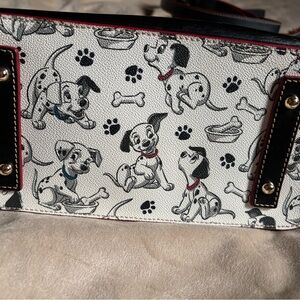 101 Dalmatian Dooney & Bourke handbag with a playful Dalmatian print. Features black and red accents.