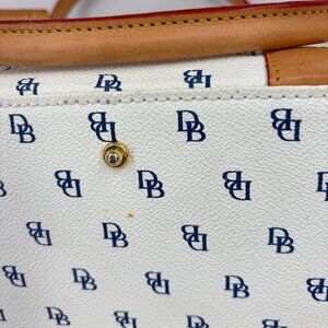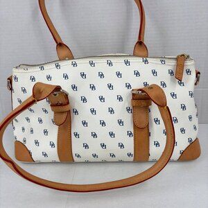 This chic Dooney & Bourke satchel features a white monogram logo design and tan leather accents.