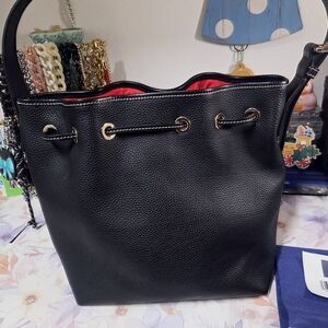 Dooney & Bourke black pebble leather bucket bag with vibrant red interior lining. Features a drawstring closure, tassel accents, and gold-tone hardware.Stylish and versatile for everyday use. In like new condition, comes with dust bag and authenticity receipt !!