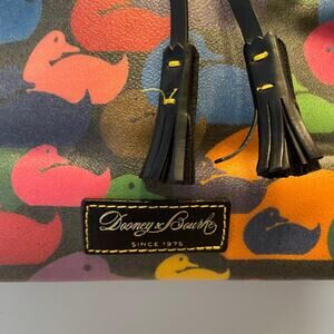 Rare and collectible Dooney & Bourke “It Collection” Duck Tote, featuring the vibrant multicolor duck print on coated canvas with black leather trim, gold-tone grommets, and signature tassels.