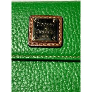 The Dooney & Bourke Flap Wallet in Lime Green is a stylish and functional accessory for women. Made from leather with a pebble grain design, this wallet features a solid green color with the brand's signature logo as an accent. The wallet has a zipper coin closure, multiple credit card slots, and a snap tri-fold design for organization. With dimensions of 4" x 5" x 1", this wallet is both practical and fashionable, perfect for everyday use or special occasions.