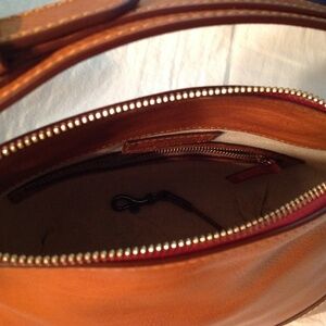 Dooney & Bourke Florentine Leather Hobo in Natural color. Measures 8"L x 4.5" w x 7.5" Hi. Adjustable handles. Tassle top zipper closure. Feet on bottom. One inside zip pocket, One open inside pocket. Lined. Extra design on side. Dusybag included. Never used.
