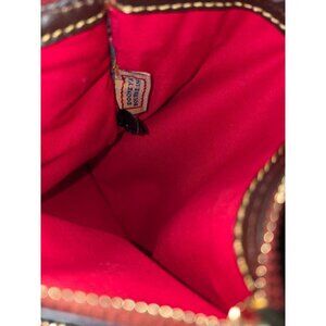 Adjustable strap, main entry zip closure, two front zip pockets, back slip pocket, leather logo patch, goldtone hardwareRed lined interiorMeasures approximately 8.25" x 8.25" x 0.25" with a 23" to 27" strap drop, weighs 14 ozBody/trim 100% leather; lining 100% cottonImported