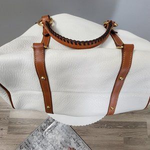 Florentine Satchel with crossbody strap. Never been used, only stored. Marks in front from storage with handles pressed on bag. Pebbled leather.