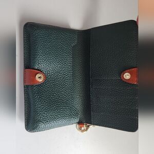 Elegant Dooney and Bourke wristlet in bautiful forest green cokor with gold hardware. Features a sleek strap and signature logo.