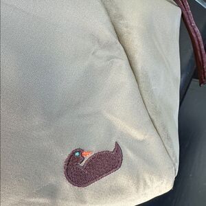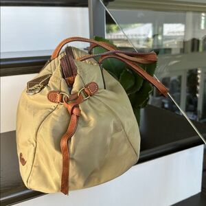 This Dooney & Bourke shoulder tote combines classic craftsmanship with a fun pop of color inside. The exterior is made from durable, easy-to-clean nylon in a soft neutral tan tone, complemented by genuine leather trim and handles in rich chestnut brown. The leather is soft and smooth with no cracks or peeling, and the handles are strong and comfortable to carry.