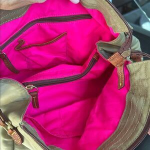 Dooney & Bourke Genuine Leather Trim Nylon Shoulder Tote Purse, Neutral Tan, Hot Pink Interior, Excellent Condition