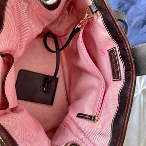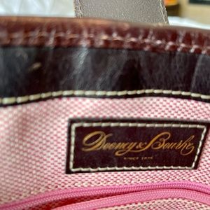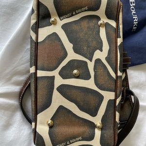 NEW Dooney & Bourke shoulder bag is from the exotic Giraffe canvas collection, with leather trim. BARELY used, pristine condition. I LOVE this bag but didn't use as much as I thought. Been sitting in closet for a while & time for her to be loved and used by someone else. Shoulder straps, roomy interior, side snaps for when you need more space. Please see pics for measurements also *strap drop length 9.5" *durable cloth lined *5 studded feet on bottom * leather strap closure *approx measurements H 10.5" W 6.25" L 12.75". Comes with dust bag. Clearing out closet - must go! All offers considered.