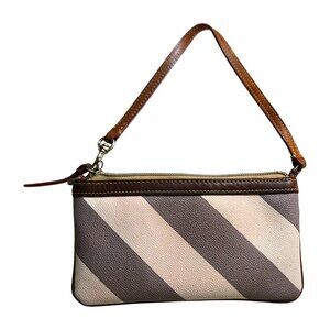 Chic and classic Dooney & Bourke medium wristlet featuring the brand’s signature diagonal stripe pattern in gray and cream. Trimmed in genuine brown leather with a top zip closure and detachable wrist strap for easy carry.