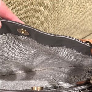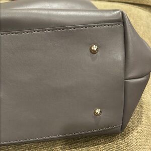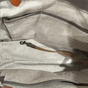 This Dooney & Bourke tote in a sophisticated gray hue features a spacious design with a minimalist aesthetic. The contrasting cognac leather handles add a touch of elegance, making it perfect for everyday use.