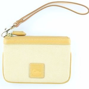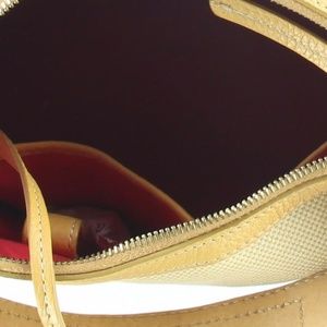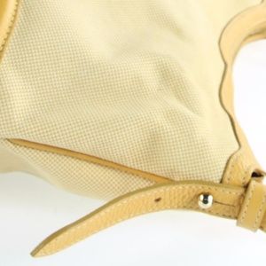 This is a nice light weight bag and is in very good used condition. Material: Canvas, Pebble Leather, Color: Yellow, Hardware: Gold Tone, Closure Type: Zipper, Lining: Lined, Strap Style: Adjustable Strap, Handle Size: Fits Over Arm, Bag Height (in): 9, Bag Depth (in): 6, Bag Length (in): 14, Strap Drop (in): 7. Smoke free/pet friendly.