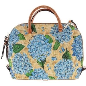 A blooming beauty that's hard to come by! This Dooney & Bourke Domed Satchel features a rare and retired hydrangea floral print set against a charming wicker-style backdrop. With soft blue blossoms and rich green leaves, this satchel delivers garden-party elegance with timeless Dooney quality.