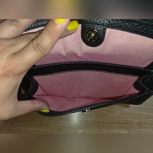 Features: Front magnetic pocket with metal logo, bottom feet, magnetic closure, double handles, cotton lined interior, one back wall zip pocket and slip pocket, two front wall slip pockets one with snap closure, key keeper.