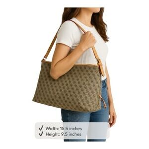 This Dooney & Bourke Large Hobo Bag features a taupe/beige monogram canvas design with luxurious tan leather trim and red edge detailing. This spacious and stylish bag is perfect for everyday use, combining elegance with functionality.
