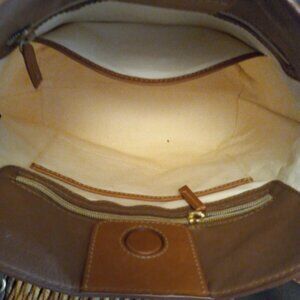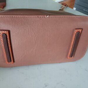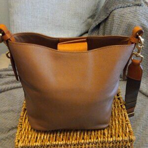 Dooeny & Bourke fine grained Italian calfskin leather in a caramel color. Gold-tone hardware. Lined in cream canvas, with four lined pockets (two open, two zip). Key fob. Solid magnetic closure. Wide, adjustable shoulder strap made of durable twill. Outside zipper pocket. Footed bottom. Strap drop is adjustable and detachable from 17 to 24 inches, so you can wear it as a shoulder or crossbody bag.