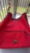 Red Dooney and Bourke nylon wayfarer hobo with leather trim and gold tone hardware. Front zip pocket. Zip top. Adjustable strap. Three inside slip pockets, one zip pocket, and key holder.