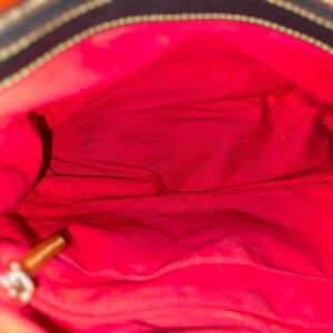 Shoulder strap and crossbody strap, beautiful navy and brown exterior with clean red interior. No odor: leather is in great condition, slight wear on the hand straps