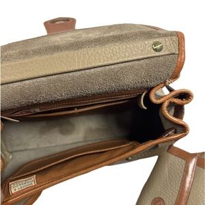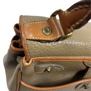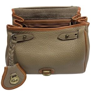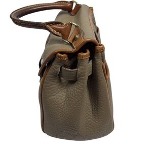 The Dooney & Bourke Leather Purse is a rare and sought-after complete set featuring a small satchel/top handle bag with a width of 26 inches, height of 23 inches, and depth of 6 inches. Made from high-quality leather with a matching brown interior and gold hardware, this purse is perfect for women who appreciate classic style and exceptional craftsmanship. With its timeless design and quality construction, this Dooney & Bourke purse is a must-have accessory for any fashion-forward individual.