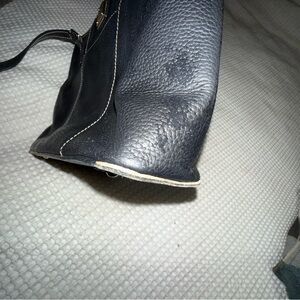 Elegant black leather tote bag perfect for everyday use. Features a spacious interior and sturdy handles for comfortable carrying. Has some wear on base and inside of handles, but still in good condition