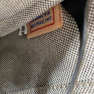 A beautiful Y2K signature canvas and leather dual handle buckle satchel shoulder bag from Dooney & Bourke's early 2000's Anniversary collection. Featuring a durable grey canvas exterior with off-white cotton twill lining and glossy black leather dual rolled handles and trim. Inside are three compartments, 2 with magnetic snaps and the middle is zippered and has a cell phone and zip pocket. Protective feet on bottom. Dooney medallion hang tag on the zipper. This bag fits neatly on the shoulder and is structured so holds its shape and can be placed on a surface without the contents being disturbed. Excellent preowned condition with no flaws. Photos are part of the description, please zoom in for more details.