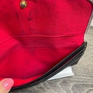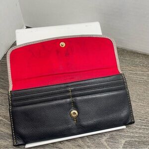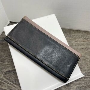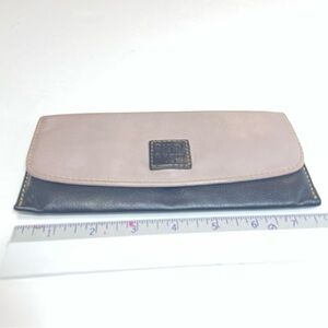 Stylish leather wallet in taupe and black. Features Dooney & Bourke logo.