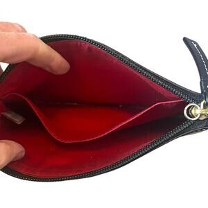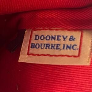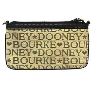 Adorable little Dooney & Bourke Wristlet Mini Bag. Strap can be attached two ways. Zip closure, interior pockets. Fabric spellout logo on cream background.
