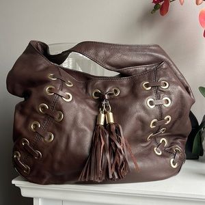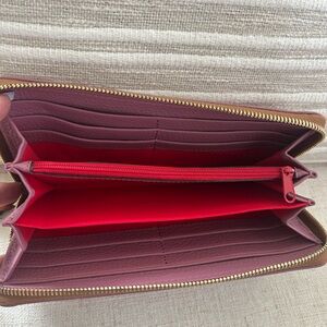 This elegant wallet from Dooney & Bourke features a sophisticated blend of purple and brown hues, crafted from premium leather. Its zip-around design and wristlet strap offer both style and convenience, making it an ideal accessory for everyday use.