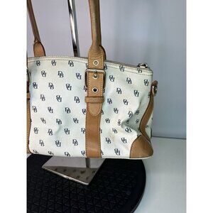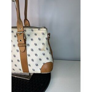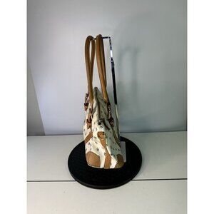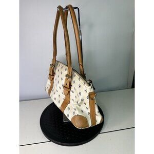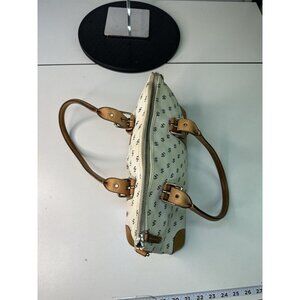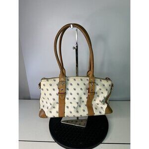 The Dooney Bourke Medium Leather White Tan Handles bag is a stylish and versatile satchel/top handle bag made from pebbled leather with beige handles. It features a zip closure, inner pockets, and a bag charm accessory. This United States-made bag boasts a classic rectangular shape with a medium size, perfect for everyday use. The white exterior color with the brand's logo pattern embodies a timeless USA-themed design, making it a chic and practical choice for women who appreciate quality craftsmanship and timeless style.