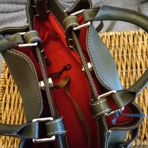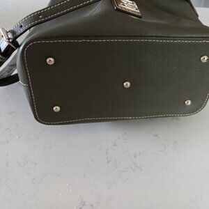 Dooney&Bourke Saffiano Leather mini Barlow in Olive color with gold tone hardware, double handles, magnetic snap closure, adjustable/removable crossbody strap, front and back pockets with magnetic snap closure, metal-plated logo, five bottom gold tone feet