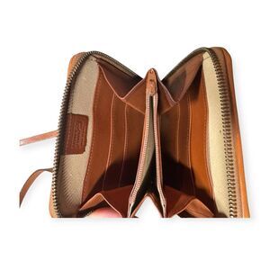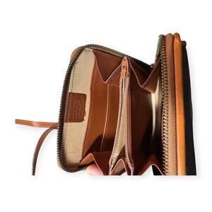 Great quality crafted in leather, brass tone hardware, leather trim, zip along closure, one snap pocket on the front. leather lining and one zip pocket in the middle and space for credit cards. Crossbody leather strap removable and adjustable. The purse is in great condition whit some minor peeling inside, you can see better in the pictures. Nice style perfect for wearing everyday.