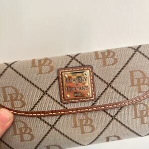 This Dooney & Bourke trifold wallet is crafted from high-quality leather with a stylish monogram design. It features the iconic Dooney & Bourke emblem, adding a touch of classic elegance.