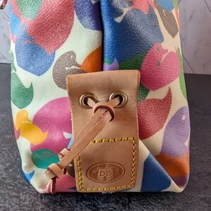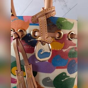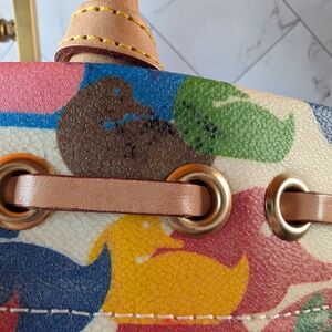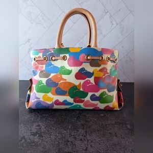 Vintage Dooney & Bourke "Wonder Duck" satchel bag featuring a multicolored duck pattern and leather tassels. Features sturdy handles and tassel detail. Perfect for daily style. She has a couple of marks that I couldn't remove. She comes with her COA and branded dust bag.