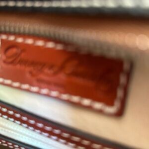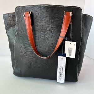 New Dooney & Bourke black leather large satchel. Dark tan handles with tan leather tassels. Large front pocket with leather strap closure. Interior is cream leather with 1zippeted pocket, 1 large slip pocket for cell phone and two slip pockets. Key holder and leather shoulder strap. 4 stud feet on bottom.