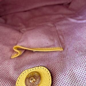 New with registration card Dooney & Bourke pale yellow pebble leather tote. Handbag has been in storage that is why it is wrinkled. The wrinkles will subside once the bag is in use. Nothing permanent. Interior lining is the red checkered Dooney lining. Large zippered compartment separates the inside of the bag. 1 zippered pocket, 1 small zip pocket and a key holder. dust bag included.