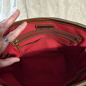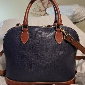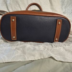 The Dooney & Bourke navy blue and brown leather dome satchel is a stylish and versatile handbag for women. With a solid navy exterior, brown double handles, and gold hardware, this medium-sized bag exudes sophistication. The dome shape, zip closure, and fabric lining make it practical for everyday use, while features like inner pockets, a removable strap, and adjustable strap add convenience. Perfect for adding a touch of luxury to any outfit, this satchel from the Dooney & Bourke Pebble Grain collection is a must-have accessory for the modern woman.