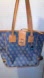 Elegant tote with iconic logo pattern. Features tan leather accents and sturdy handles.