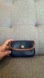 Elegant navy clutch with tan trim. Features gold logo accent. Perfect for any occasion. Missing the strap but in good condition perfect for any occasion