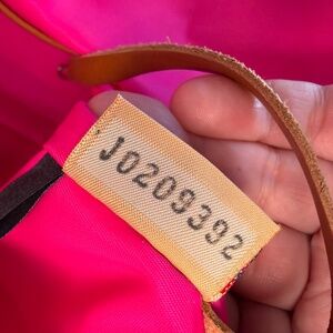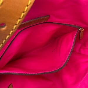 Nicely tanned vachetta leather top handles have little wear, clean inside and out. There is 1 blue pen mark on the inside of back pocket.