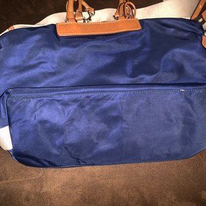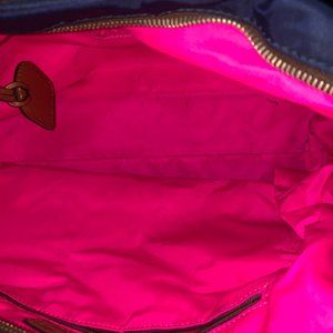 Authentic, preowned but gently used Dooney & Bourke tote. Nylon material with leather trim. Color is navy blue pink with pink/magenta lining. Has some scuff marks inside (see pics). Perfect for general wear, overnights trips, and/or school.