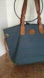 Navy nylon shopper tote with leather handles and side ties. Red lining. Bag shows wear in and out. Used as every day carry all. Still fully functional. Patina to leather. One rip in lining where zipper should be on inner pocket(zipper missing) Some wear to corners. Tried to show pics of all marks.
